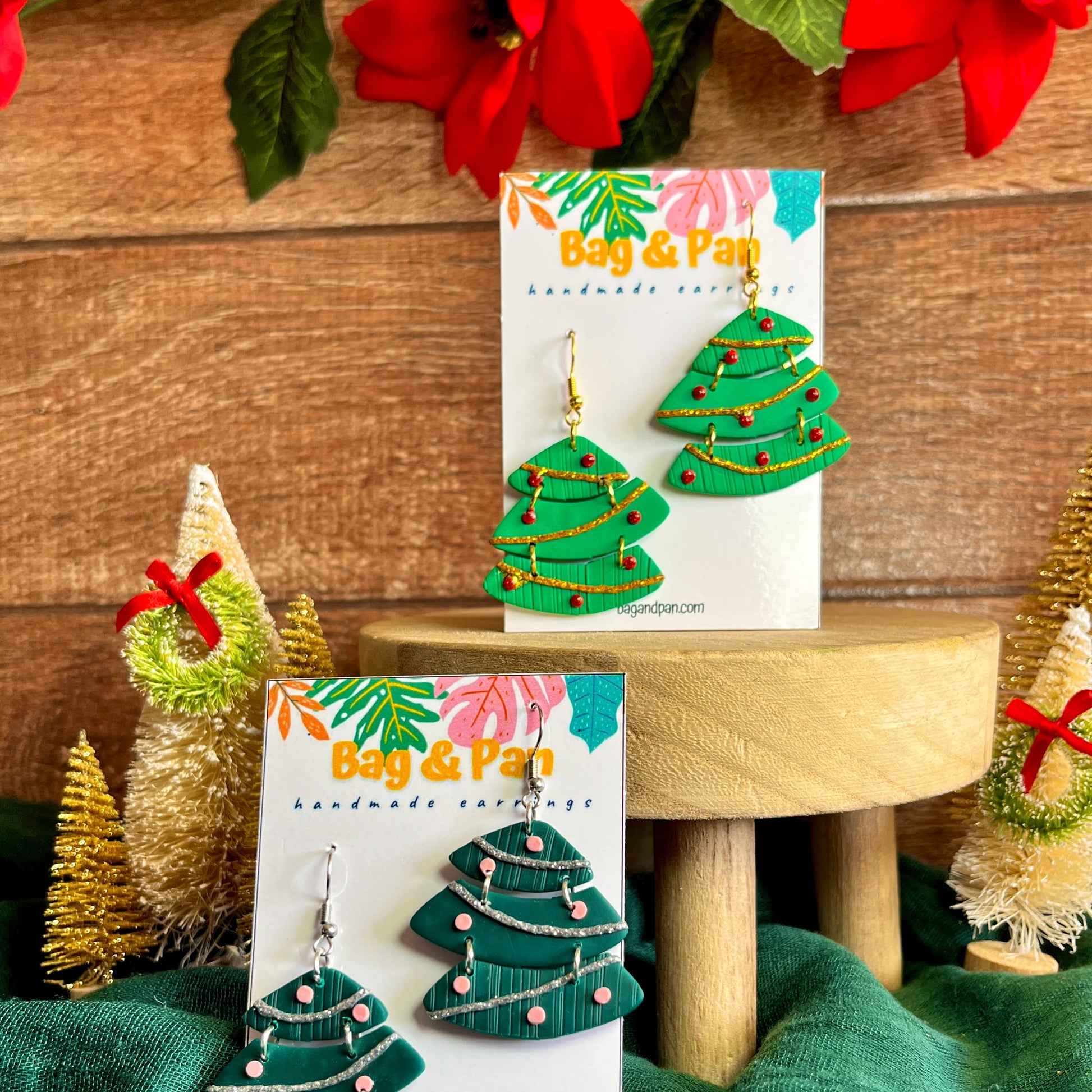 Celebrate the season in style with these artful Christmas tree earrings. Available in minimalist or embellished designs, they’re a perfect festive accessory.